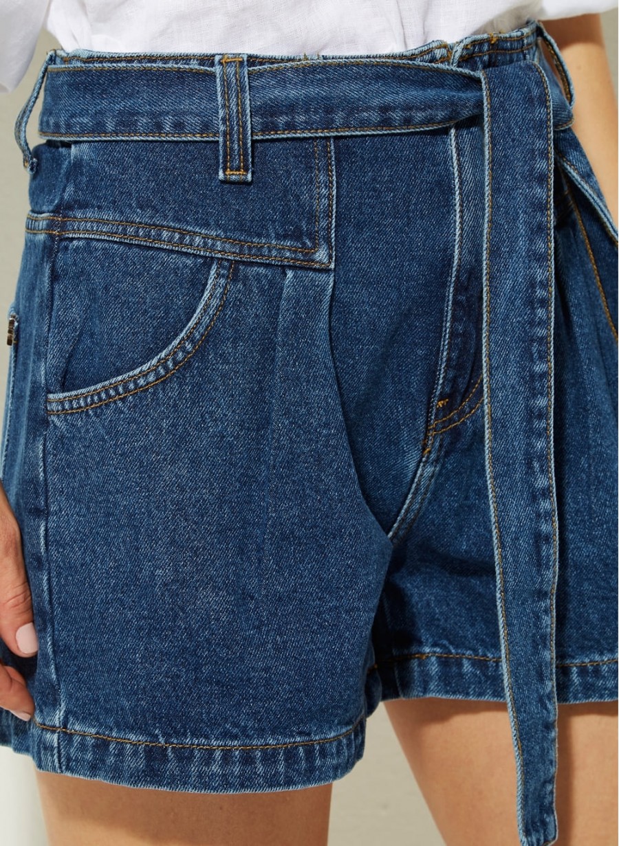 Confeccionado em jeans com lavagem média, o Shorts possui modelagem reta, cós com passantes e faixa, fechamento frontal interno, bolsos frontais e posteriores, pregas frontais e recortes com acabamento pespontado.